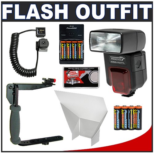 Phoenix DZBIS-112iTTL Digital Autofocus Flash (i-TTL, D-TTL, TTL) + 8 Batteries & Charger + Flash Bounce Reflector + TTL Flash Cord + Stroboframe 350 Flash Bracket for Nikon D40, D60, D3000, D3100, D5000, D5100, D7000, D300s, D3 & D3s Digital SLR Cameras Review